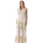 Experience timeless beauty with this ethereal maxi dress, featuring delicate golden floral embroidery that exudes sophistication. The layered design and soft, flowing fabric create an airy and graceful silhouette, perfect for weddings or elegant gatherings. Available in a variety of colors, this dress effortlessly combines allure and comfort for any special occasion.