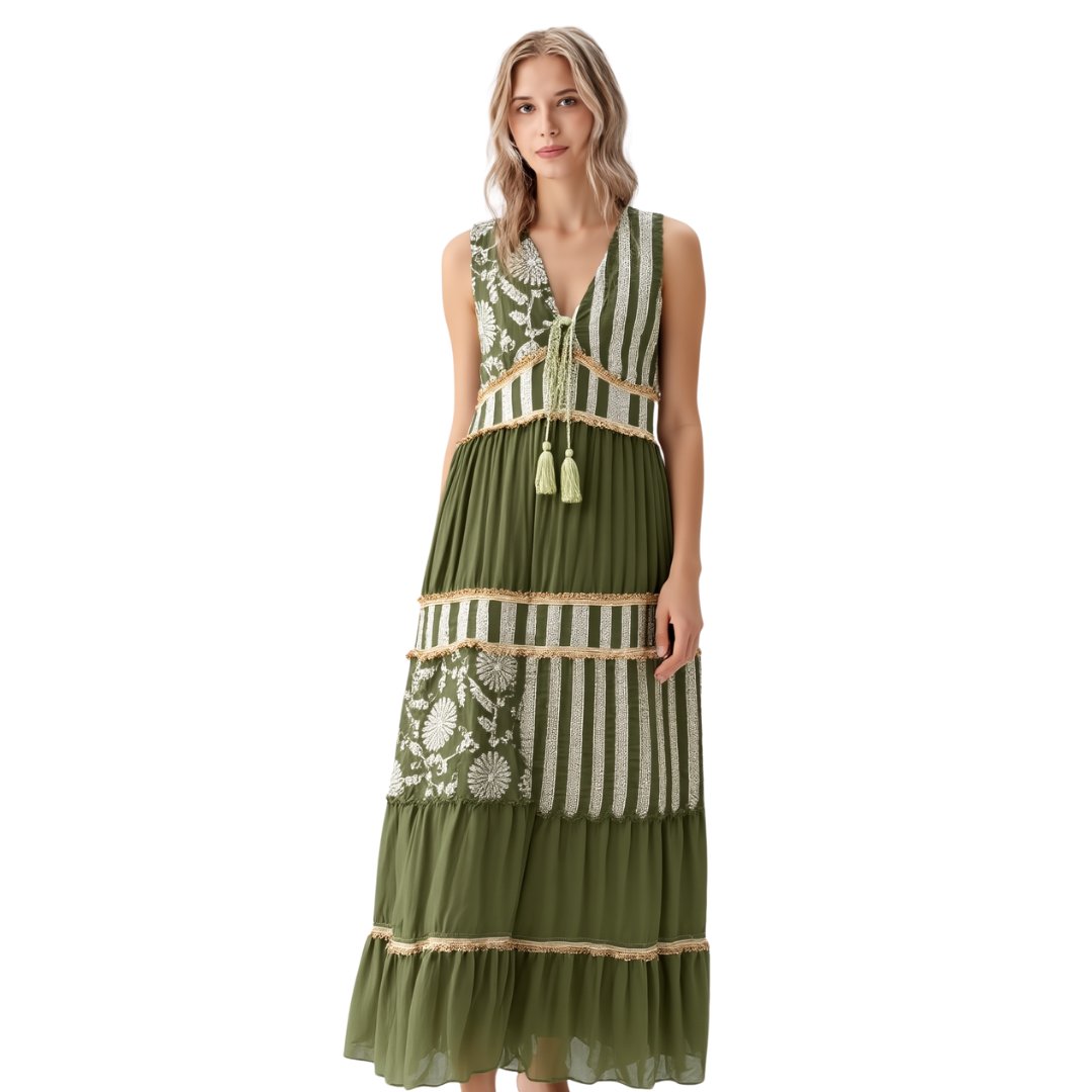 This boho-inspired patchwork maxi dress showcases a V-neckline and sleeveless silhouette. Its design incorporates various patterned sections, including white floral embroidery and stripes, accented with tan trim and green tassels adorning the neckline.
